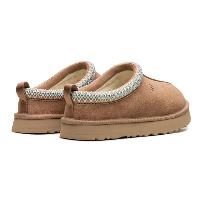 The upper of this version of the UGG Tazz Slipper is made entirely of suede and is sand-tan in color. The UGG brand logo appears imprinted into the lateral side of the shoe, and a single seam runs down the middle of the upper to hold the two sides together. The heel has a draw tab, and the opening is lined with decorative stitching in white and very light blue. UGGplush wool is used to make the lining for warmth and comfort. The sole of the shoe is made of chunky sand rubber.
