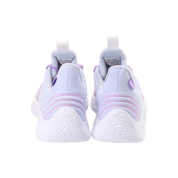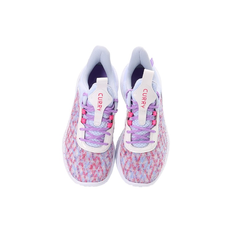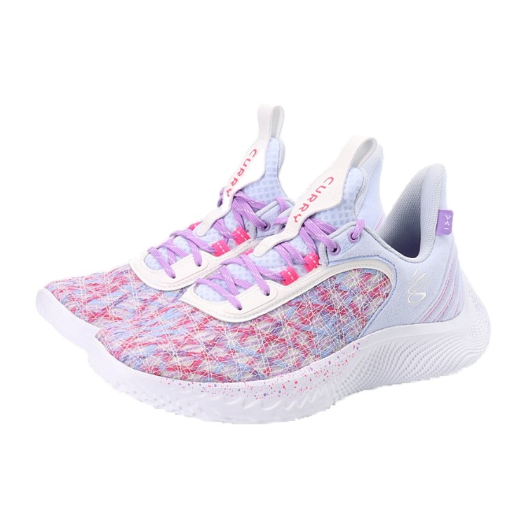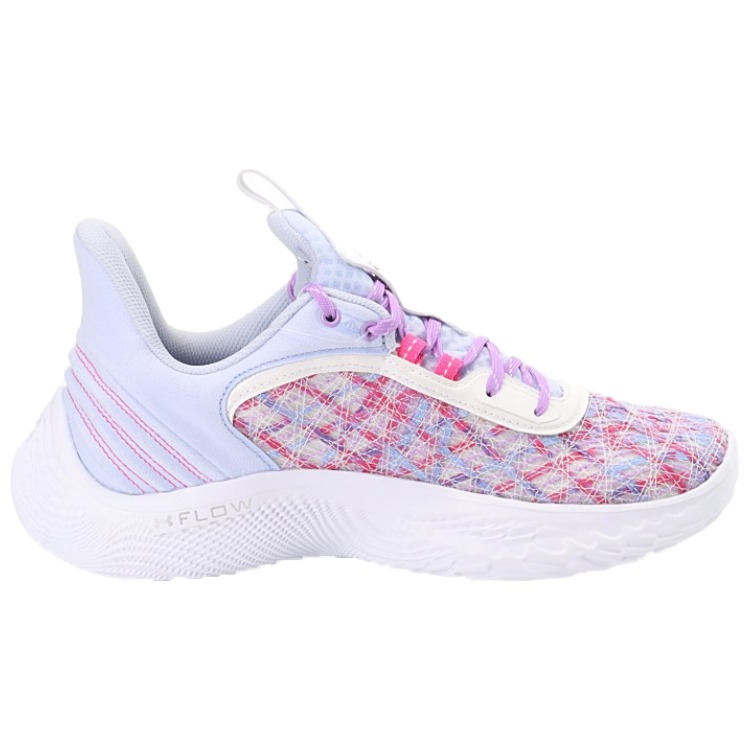 The Under Armour Curry Flow 9 For the W is the ninth collaboration between Under Armour and basketball player Stephen Curry. The sole of the Under Armour Curry Flow 9 features multicolor speckles on the lateral side and a gentle texture that builds up on the heel. The underfoot is embellished by the UA Flow technology that enhances traction. An Oxford Blue suede overlay covers the heel counter to match the fabric lining visible in the collar. The heel also has Vivid Lilac stitches that give rise to a pleated design. The intricate lacing system consists of punched eyelets on a white synthetic leather eyestay overlay, pink webbed eyelets, and a “CURRY” branding on the tongue logo. What makes the Under Armour Curry Flow 9 For the W outstanding? We like the multicolor, lightweight upper on the front of this sneaker. It features Oxford Blue and Vivid Lilac wide mesh, a transparent overlay, and the performance-oriented UA Wrap technology. The sneaker was released on July 8th, 2022, for $140.